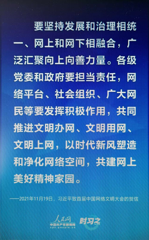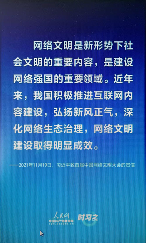 11月19日上午,首屆中國網(wǎng)絡(luò)文明大會在京開幕,中共中央總書記、國家主席、中央軍委主席習(xí)近平致信祝賀。網(wǎng)絡(luò)文明是新形勢下社會文明的重要內(nèi)容,是建設(shè)網(wǎng)絡(luò)強(qiáng)國的重要領(lǐng)域。習(xí)近平總書記高度重視網(wǎng)絡(luò)生態(tài)治理,強(qiáng)調(diào)要培育積極健康、向上向善的網(wǎng)絡(luò)文化。