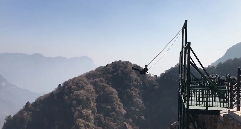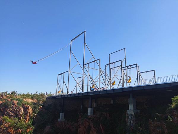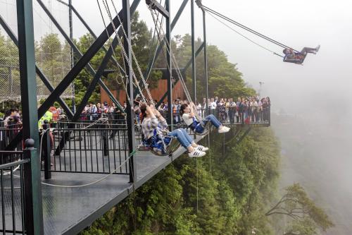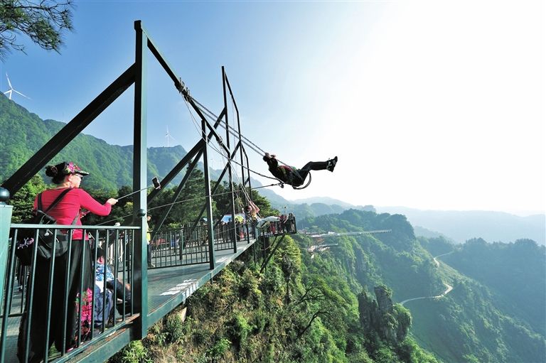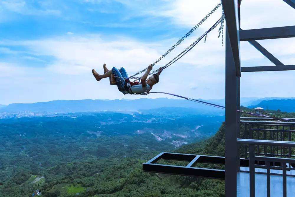 懸崖秋千是一種懸崖邊的極限刺激運動。秋千的座椅,被電吸鐵拉到懸崖內(nèi)側(cè)于15米-25米高的地方,吸鐵忽然松開,長長的秋千瞬間向懸崖外蕩去,帶給人以刺激感覺。
